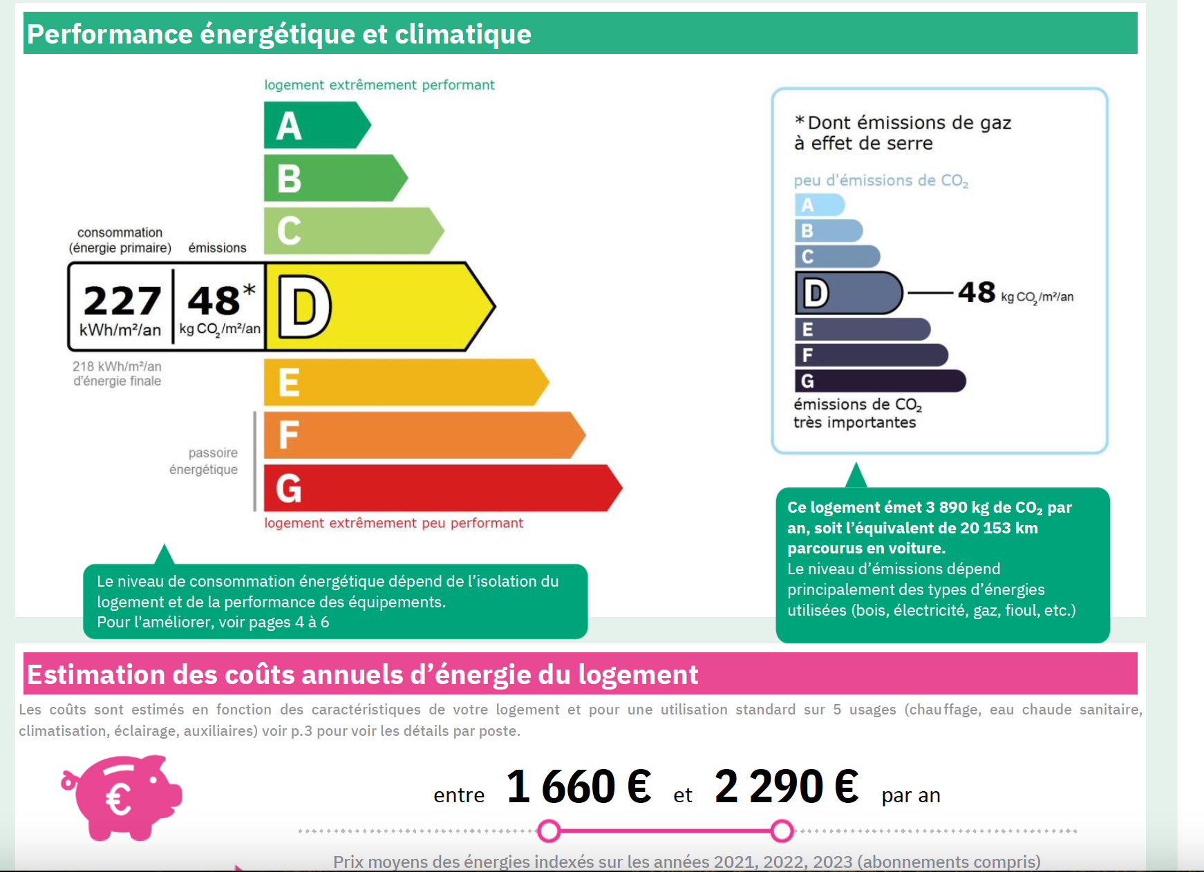 Montant des dépenses d’énergies annuelles entre : 1660 € et 2290€.
